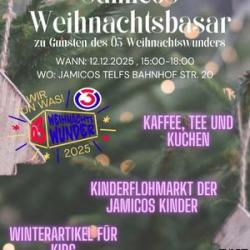 Am 12.12.25 von 15-18 Uhr findet im Jamicos Telfs, Bahnhofstraße 20 ein Weihnachtsbasar zu Gunsten des Ö3 Weihnachstwunders statt. Verkauft werden Winterartikel für Kinder von 0-12 Jahre. Zudem gibt es ein Kuchen / Kaffee / Tee Buffet.